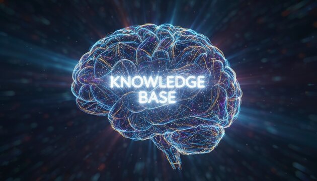 Digital Knowledge Base Text Over Glowing Wireframe Human Brain Model