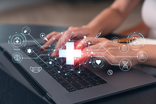 Woman typing on laptop with futuristic medical icons and digital healthcare interface overlay on modern workspace background, showing concept of eHealth system.