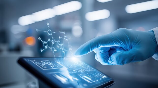 A scientist touches a holographic flowchart in a high-tech laboratory exploring molecular data and future innovations