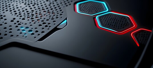Close-up of red perforated metal panel with repeating circular holes and dramatic reflective lighting, shallow depth of field and intense futuristic mood