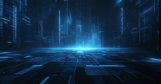 Abstract futuristic city with blue glowing lines and digital grid floor.