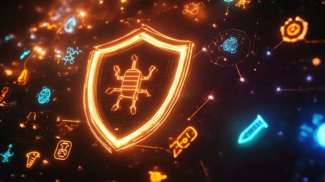 Shield protecting against harmful microbes with glowing digital elements. Generative AI