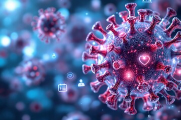 Futuristic depiction of virus with medical icons on blue background.