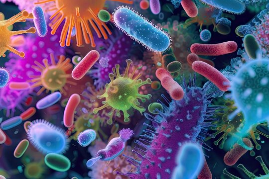 Colorful visualization of various bacteria image, Cluster of colorful bacteria cell background