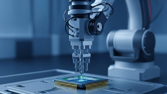 Robotic Precision: A close-up showcases a robotic arm meticulously working on a microchip, highlighting the technological prowess and the futuristic aspects of automation in industry.