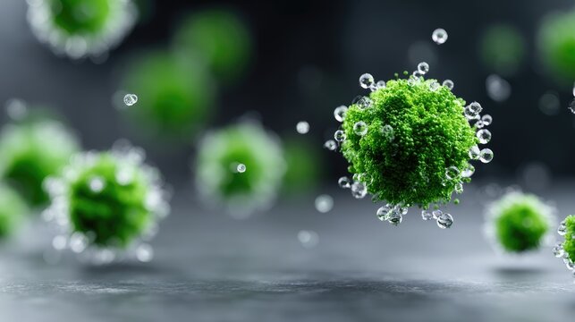 Glowing Green Spherical Virus Molecular Structure Against a Dark Gray Backdrop with Translucent Bubbles in a Futuristic Theme for Medical Visualization