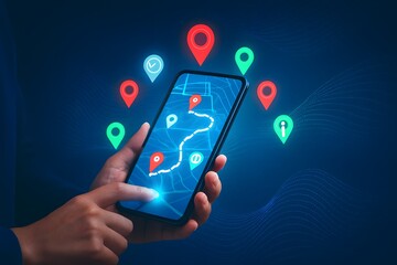 Hand holding smartphone with digital navigation map route line and colorful glowing location pins on futuristic blue background