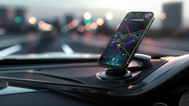 autonomous futuristic car dashboard smartphone mobile holder using navigation gps maps system concept with HUD and hologram screens and infotainment app user interface as wide banner