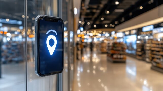 A smartphone displays a navigation icon in a modern store, highlighting the blend of technology and shopping experience.