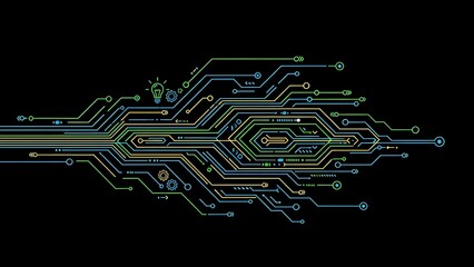 Futuristic circuit board pattern with glowing green and blue lines on black background for technology and electronics design projects.