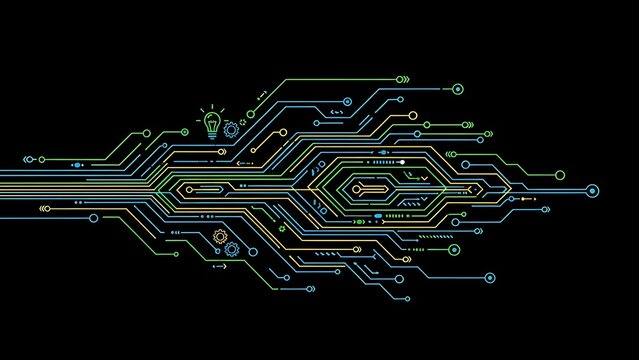 Cyber Circuitry: An advanced close-up perspective, highlighting vibrant neon circuits on a black background. This image embodies the intricate technological complexity of the digital age.