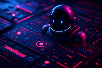 AI generated digital illustration of a sci-fi astronaut-like robot emerging from a glowing control interface, surrounded by HUD elements in neon pink and blue tones, symbolizing advanced technology