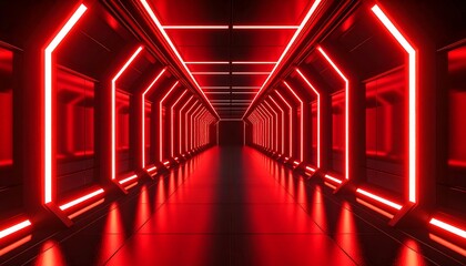 Futuristic neon digital tunnel with red light trails