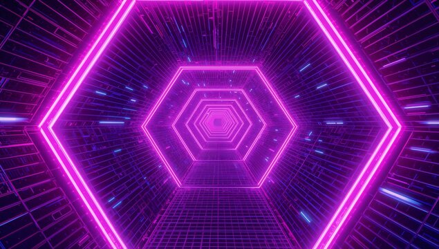 Showing neon pink hexagonal frames receding into 3D grid tunnel, blue and magenta light streaks