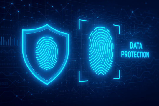 Digital Data Protection with Fingerprint Scan and Shield Icon in Futuristic Circuit Board Design cybersecurity