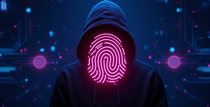 Hooded figure with a neon fingerprint face on a futuristic digital background with glowing circuit elements, symbolizing cybersecurity and anonymity. Ai generative