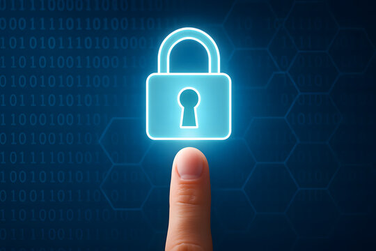 Finger touching glowing blue padlock icon representing digital security and privacy