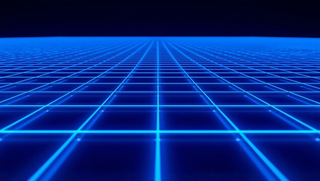Neon blue grid pattern on black background with glowing lines and squares, futuristic cyber design element with vibrant electric blue lines
