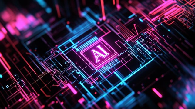 AI technology concept with digital circuit board, neon colors, and data processing elements representing artificial intelligence, machine learning, and innovation.