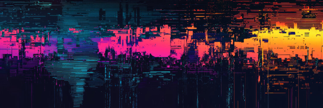 Abstract digital glitch effect with fragmented pixels and distorted lines, vibrant colors on a dark background