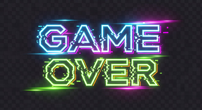 Vibrant digital 'Game Over' neon text, glowing with electric blue, pink, and green hues, showcasing a modern retro glitch effect, ideal for gaming, virtual reality, and ultimate challenge conclusions