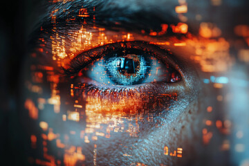 Generative AI glitch art composition of male female face merged with digital code and futuristic visual interference effect