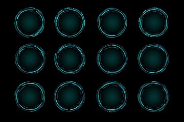 3d illustration of twelve glowing cyan abstract circular frames on a dark background