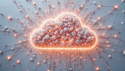 Abstract digital cloud graphic with glowing connections and luminous particles