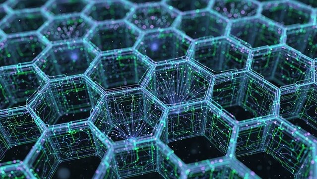 Glowing blue hexagonal grid structure with digital code and data points on a dark background representing technology and networking concepts