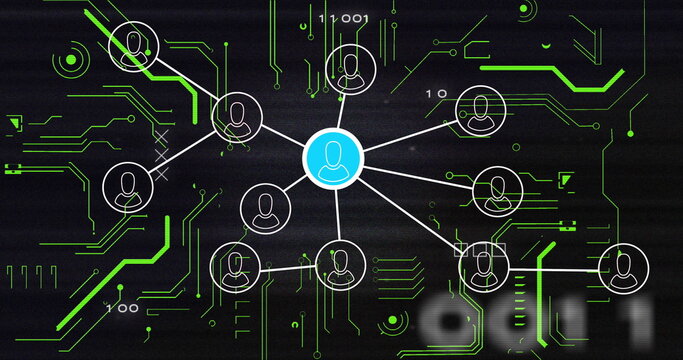 Connecting central blue user icon to white user icons on network diagram with green circuit traces