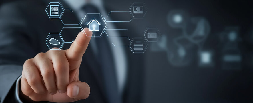 Futuristic digital interface displaying various business icons and network connections, symbolizing technology and connectivity