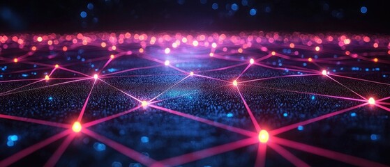 An abstract representation of a glowing network, featuring interconnected nodes with vibrant colors of blue and pink, suggesting a digital or technological theme.