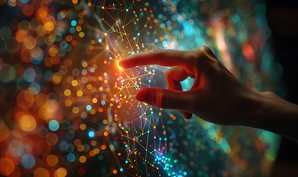hand touches a virtual screen with a network of bright, interconnected nodes and lines against a dark background, illustrating the themes of digital technology, innovative connectivity, and big data