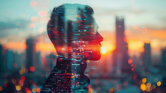 Double exposure of a young man and cityscape with vibrant data overlay, representing modern technology and urban lifestyle at sunset.
