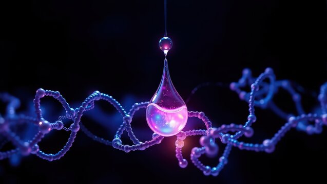 A glowing droplet suspended above a molecular structure in a dark and vibrant environment scene