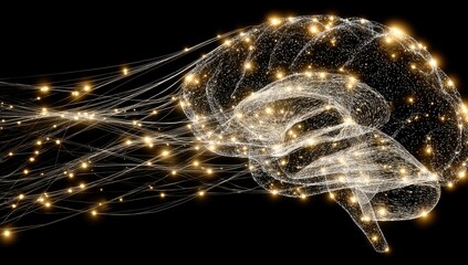 A digital representation of a brain, highlighted by glowing points and connecting lines, creating a network effect
