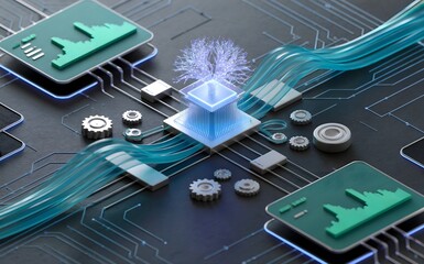 Abstract digital art featuring a glowing green plant with blue energy streams.