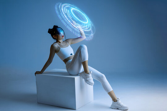 Woman in futuristic sport costume. Augmented reality game, future technology, AI concept. VR. Neon blue light.