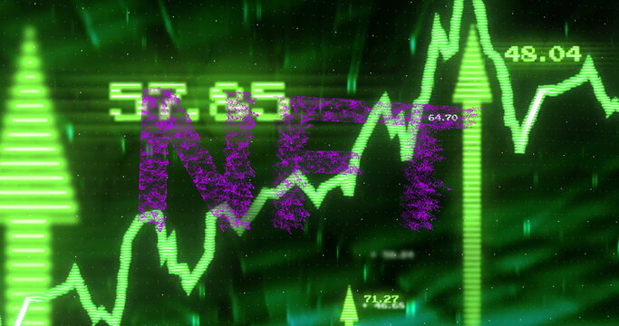 Displaying purple NFT acronym pulsing on trading screen, with neon-green line graphs, numeric data