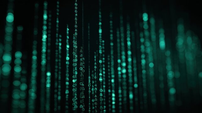 Rows of light blue binary code descend from a dark background, focusing on the center area with blurred lines and reflective surface below