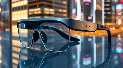 Futuristic Smart Glasses in High-Tech Workspace, Smart glasses, Virtual assistant interface projected on AR glasses in a smart office.