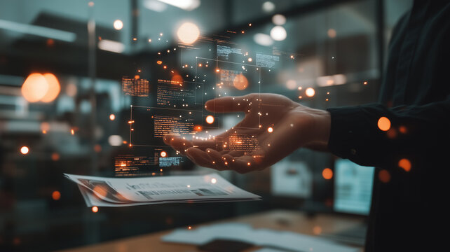 A person using a futuristic digital interface, symbolizing innovation and technology. The interface displays data visualization and interactive elements.