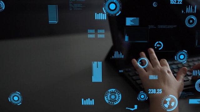 A close-up view of hands typing on a keyboard, surrounded by futuristic digital elements and data visualizations, representing innovative technology and business analytics. Xenic