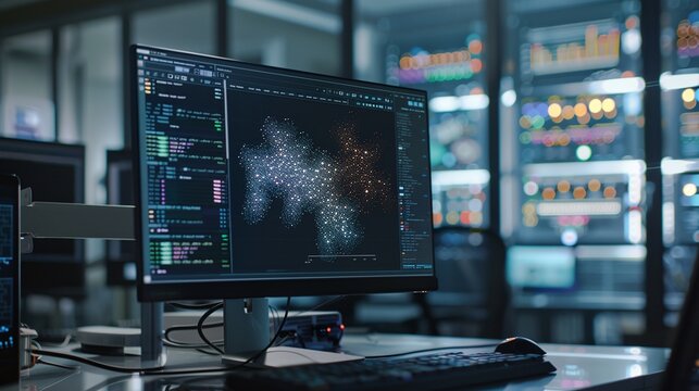 Digital data visualization with colorful graphs and charts, showcasing trends and analytics in modern office setting
