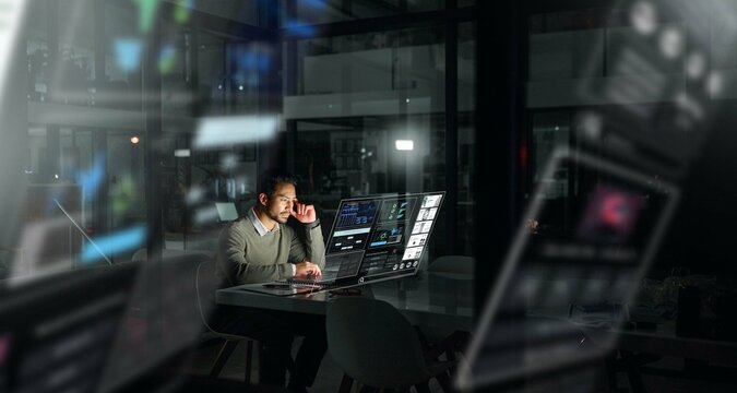 Digital technology, internet network connection, big data, digital marketing IoT internet of things. Man using modern computer surfing internet futuristic innovative technology background