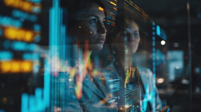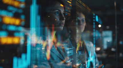 Female executives analyzing cryptocurrency charts projected on transparent screens, modern office workspace with futuristic UI elements, dynamic financial data visualization, no branding