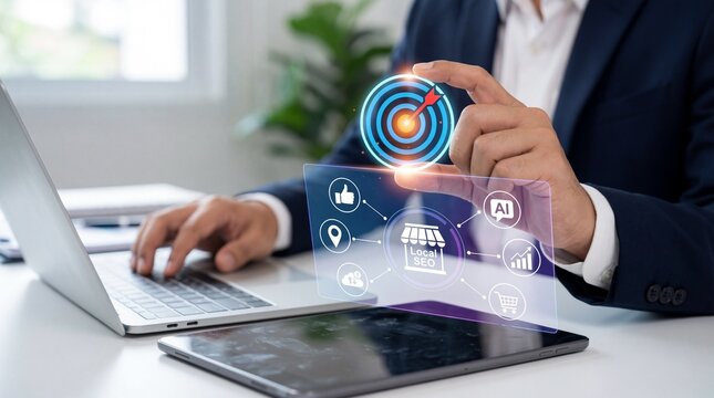 A businessman interacts with a futuristic holographic projection of a target representing business goals while working on a laptop and tablet