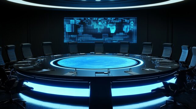 Futuristic conference table with digital projection and modern chairs in high tech meeting room for corporate discussions
