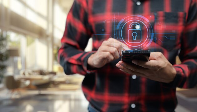 Close-up of a person using a smartphone with glowing digital padlock icon representing mobile security and data protection technology