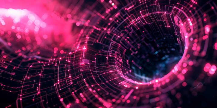 Elegant tehnologic pink dark background, surrounded by geometric patterns and shapes.